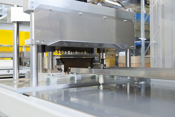 Extrusionsfolgeanlage zur Konfektionierung von großen Kabelkanälen bis 620 x 110 mm bestehend aus einer Abzugseinheit, einer Stanzeinheit, sowie einer Sägeeinheit